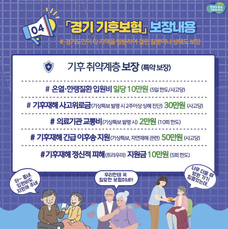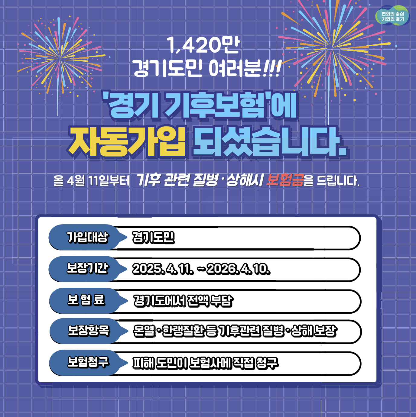 이에 경기도는 도민 건강 보호를 위한 공공형 보험 제도, ‘경기 기후보험’을 2025년 4월부터 전면 시행합니다.