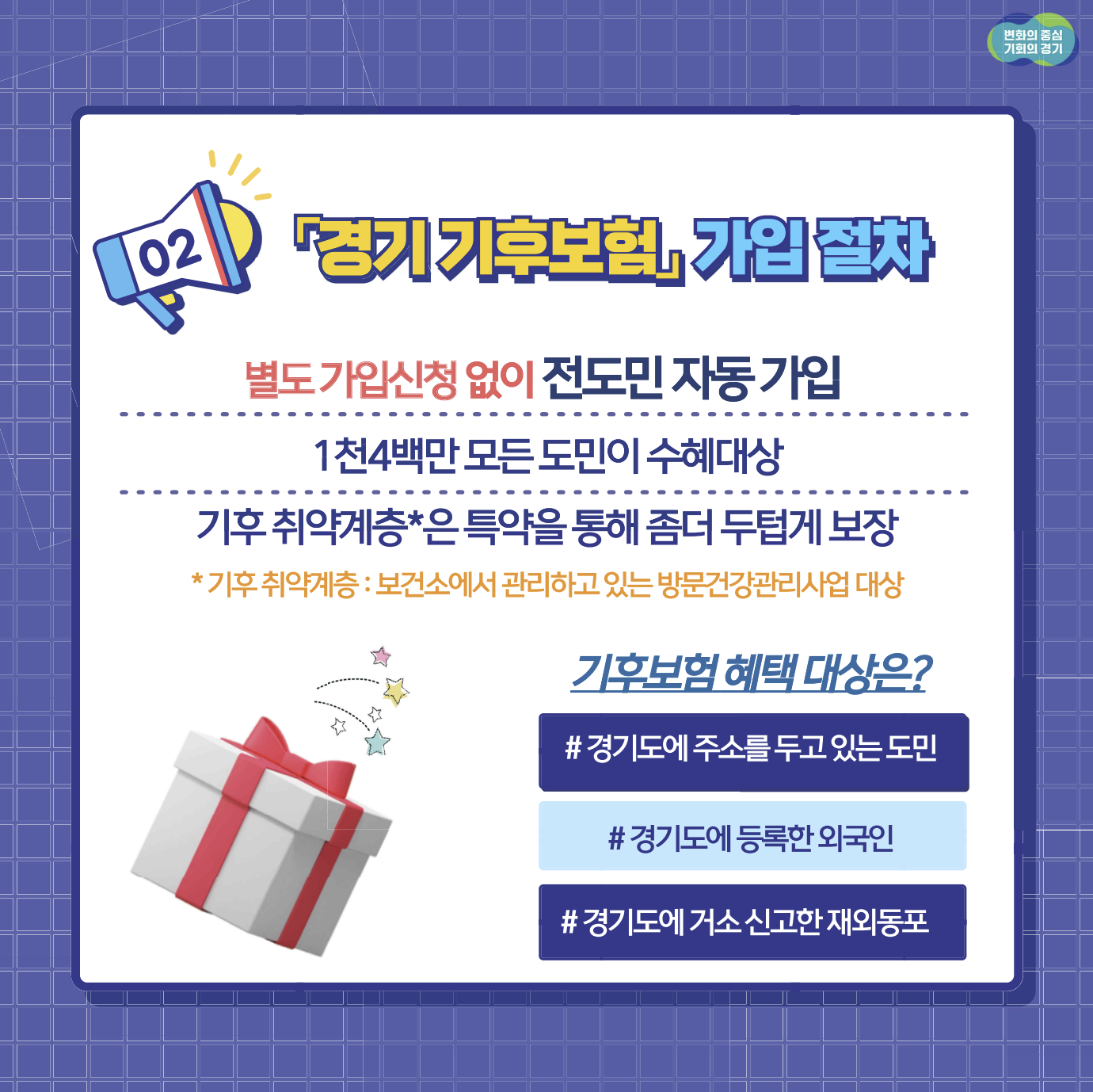 경기 기후보험은 보험료 없이 도민의 건강을 지켜주는 ‘기후 안전망’입니다.