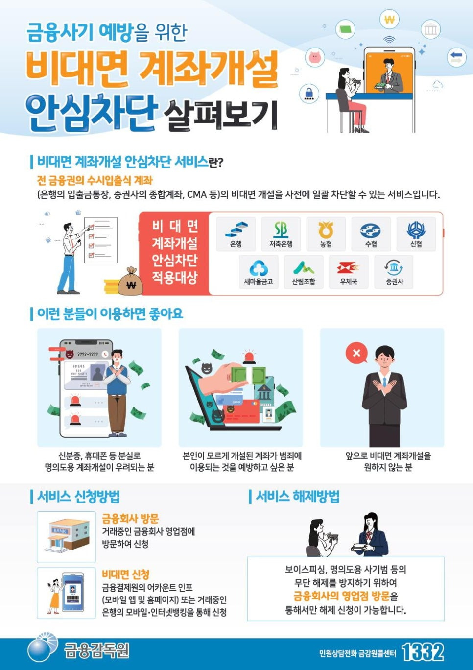 - 은행, 저축은행, 증권사, 상호금융 등 3,613개 금융기관에서 실시간으로 계좌 개설이 차단됩니다.