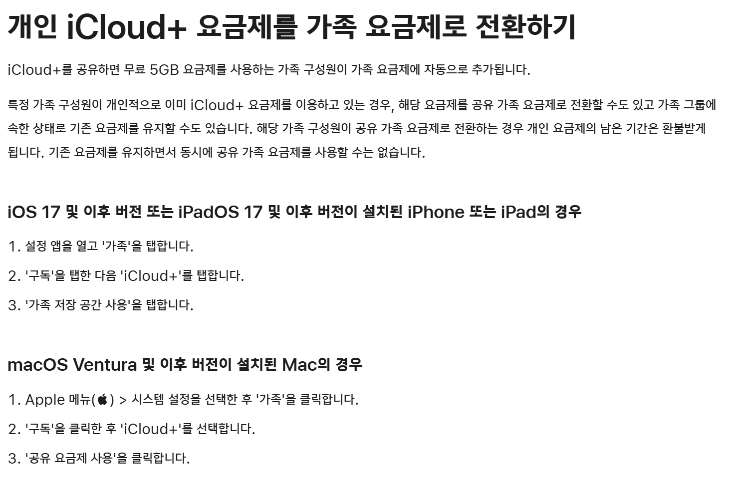 가족 공유 설정 방법 (iOS 17 기준)