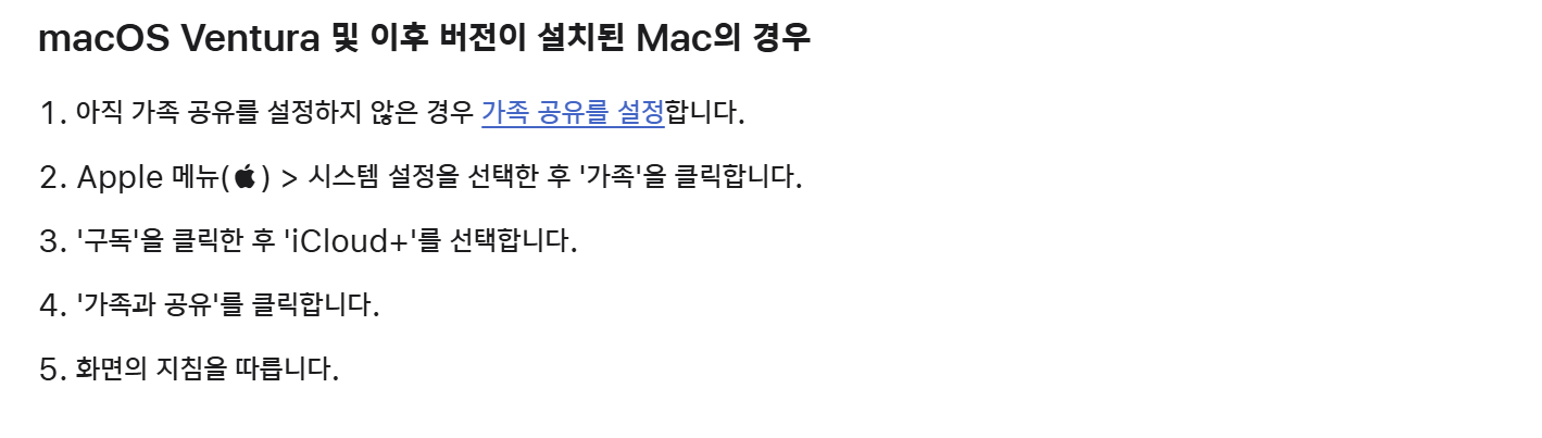 - 설정 > Apple ID > 가족 공유 선택