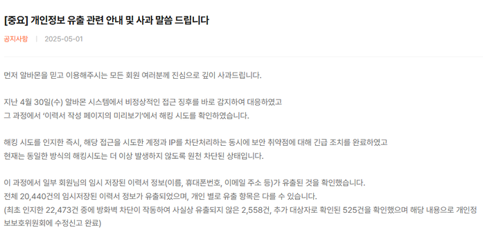2025년 4월 30일, 아르바이트 구직 사이트 알바몬에서 대규모 개인정보 유출 사고가 발생했습니다.