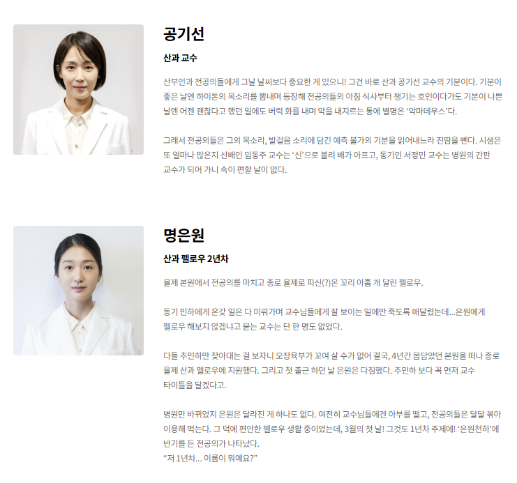 - 기은미, 차다혜: 각각 3년차, 2년차 선배로 현실 조언 및 병동 내 케미 핵심