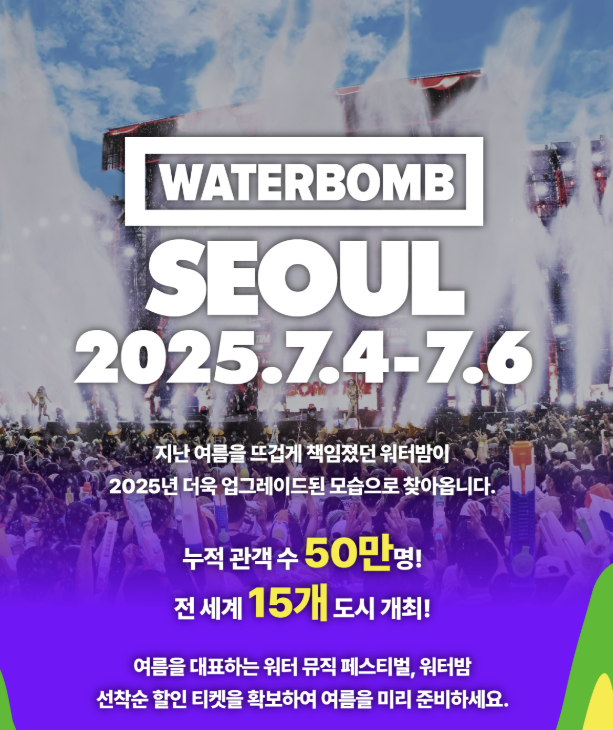 대한민국 대표 여름 뮤직 페스티벌, 워터밤 서울 2025는 7월 4일(금)부터 6일(일)까지, 경기도 고양시 킨텍스에서 개최됩니다.