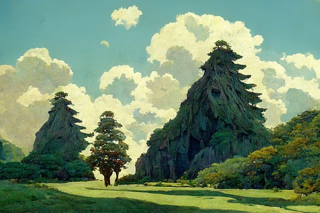 - “지브리풍의 평화로운 시골 마을 풍경을 그려줘. 풍성한 나무, 붉은 지붕 집, 연한 하늘 색감 포함해서.”