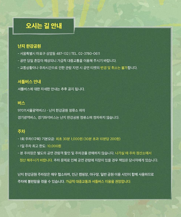 | 준비물 | 모바일 티켓, 신분증, 돗자리 등 |